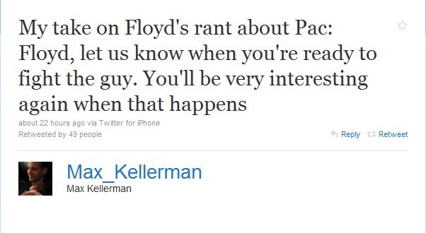 But until Pacquiao and Mayweather get it together on the business end, Money Mayweather’s act will run stale. Save up all the trash talk for the Mayweather-Pacquiao 24/7 once the fight is signed. Until then, HBO commentator Max Kellerman put it best yesterday.