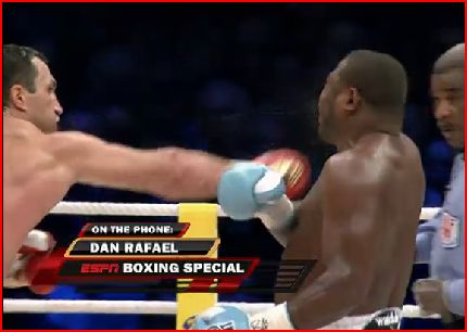 The champion favored the straight right in the early rounds. As the bout progressed, Klitschko now looked to the land the right uppercut with regularity. At times Samuel Peter was able to avoid the shot or stifle his opponent’s power. But several times in the sixth Peter fell victim to the punch. The full extent of the beating showed on his face, most notably in the large mouse under his right eye.