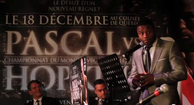 Bernard Hopkins and Jean Pascal have hit the road to promote their light-heavyweight title fight on December 18. In this footage from their Quebec City stop, Hopkins frames Pascal as another in the long line of young challengers he’s overcome like Kelly Pavlik and Jermain Taylor. Although Hopkins lost twice to Taylor, he boasts that Taylor was “never the same” following their series. He promised to take Pascal to school and prove he’s still the best at light-heavyweight. Pascal had a nice comeback on the school comment, running down his excellent high school grades, and even bringing a copy of his college diploma.