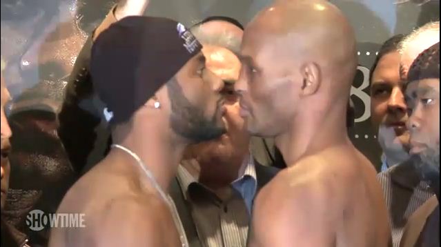 Earlier today, Jean Pascal and Bernard Hopkins completed their weigh-ins for tomorrow night’s (December 18) light-heavyweight championship fight. Hopkins came in at a trim 174.6 pounds. Pascal looked just as ripped and strong as he did against Chad Dawson, coming in at 174.1. Hopkins, known for last-minute stare down antics at weigh-ins, took the subdued approach, while Jean Pascal was the one fired up. The champ attempted to back Hopkins off the stage, and had to be restrained by his promoter and Hopkins trainer Naazim Richardson. Below is video of the entire incident.