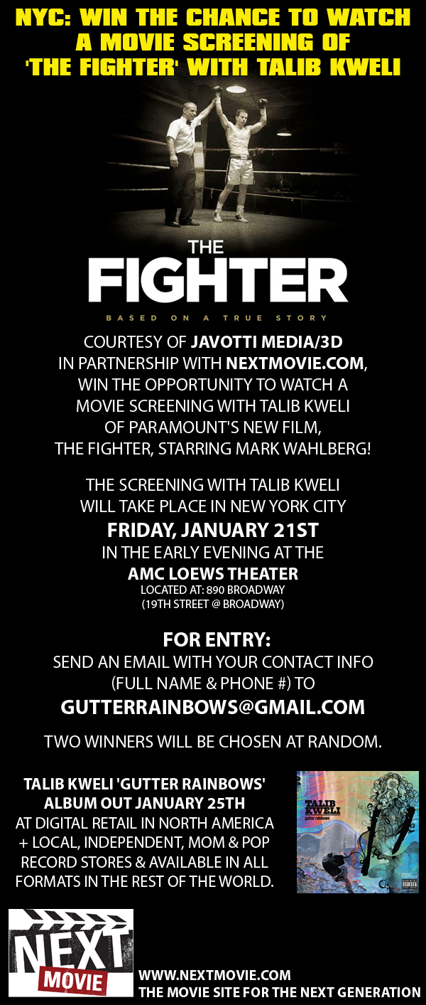 NYC readers, Talib Kweli is offering a contest to catch a free screening with him of the critically-acclaimed film The Fighter.