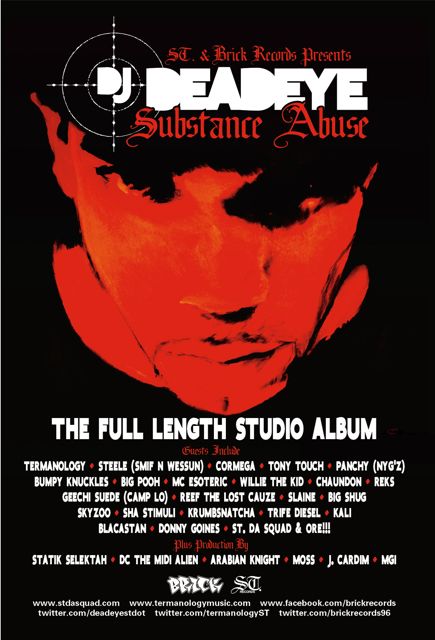DJ Deadeye is not a name you’ll recognize right off the bat. As Termanology’s DJ and member of ST. Da Squad, he’s been honing his skills through mixtapes and serving as an opening act for the likes of Ghostface Killah, DJ Premier, M.O.P. and Kanye West. And you can see from the above photo, he’s built an impressive list of contacts. Now, he’s ready to take a stab at the spotlight with his own full length project, Substance Abuse.