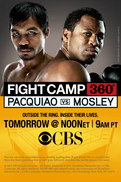 Earlier today Showtime presented their first Fight Camp 360 for May 7’s superfight between Manny Pacquiao and Shane Mosley. The main difference with this Fight Camp from the previous eight is its airing on CBS instead of Showtime. Considering CBS reaches 90 million homes, that’s not bad promotion for a fight. Check out the clips and see if Showtime is taking complete advantage of the opportunity.