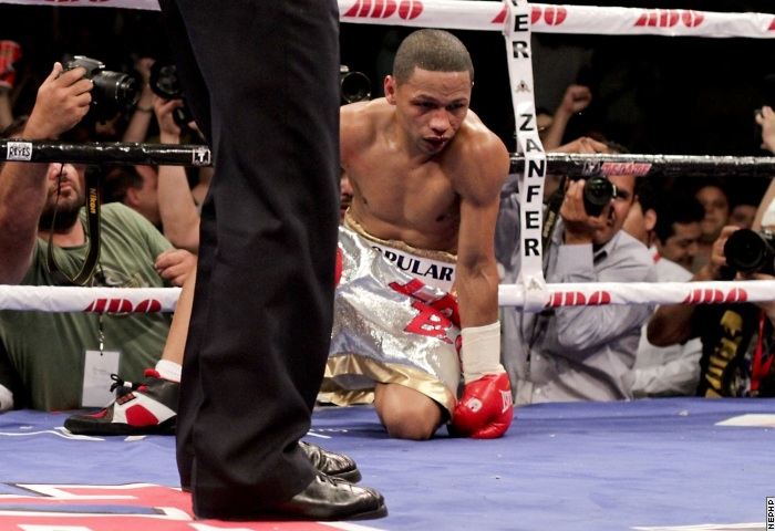 Calderon was already laboring by the third. A right upstairs pushed the Iron Boy to the ropes, and Segura brought him to his knees with a right hand to the body. Perhaps remembering the slow beating from the first fight, Calderon took the 10 count from referee Samuel Viruet despite being able to continue.