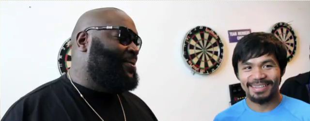 Since it was confirmed earlier this week that Rick Ross would be accompanying Manny Pacquiao to the ring on May 7, fans have speculated what song the Maybach Music Group leader would perform. “BMF?” “Pacman?” “9 Piece?” In this just released video recording on their first meeting, Ross promised Manny that he would be debuting something “just for you.” Can you envision a smiling, aloof Manny strutting to the ring while Ross raps about assorted cocaine, kingpin fantasies mixed with boxing commentary? That surreal image might end up being worth the pay-per-view price alone. And according to Ross’ camp, the entire Pacquiao team will be sporting these limited edition Maybach Music Pacman t-shirts. Maybach Music Group’s Self Made compilation has been moved up and will hit stores on May 24. You can preview that project’s tracklisting after the video.
