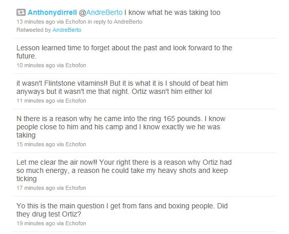 Super-middleweight contender Anthony Dirrell supported Berto’s statement by claiming he also knows the performance enhancing drugs Ortiz allegedly took. The full Twitter conversation can be viewed below.