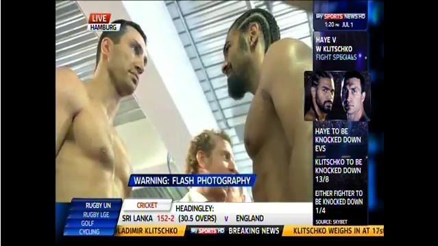 Before a very vocal contingent of British fans, David Haye and Wladimir Klitschko appeared to be in the best physical shapes of their careers heading into tomorrow night’s long-awaited heavyweight showdown. Haye weighed in first at 213 pounds. In his last fight, an easy 3rd round TKO over Audley Harrison in November, Haye tipped the scales at 210. Wladimir Klitscko is also in tremendous shape, coming in at 242. Klitschko’s weight is five pounds less than his last bout, a September 2010 TKO over Sam Peter. At the staredown, Wladimir adopted the steely gaze normally done by his brother Vitali. Haye used the opportunity to add some last-minute trash talk. Haye-Klitschko will air live tomorrow on HBO at 4:45 PM ET.