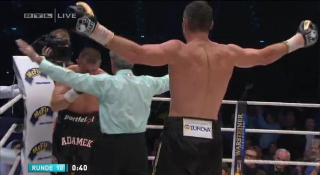 After three more rounds of heavy right hands, Adamek was visibly laboring and resigned to his fate. Klitschko picked up his pressure and had Adamek shaken whenever a right hand landed. Adamek’s equilibrium was gone, causing every solid punch to have him stumbling across the ring. Adamek had capitulated all but verbally, and referee Massimo Barrovecchio gave him a few more chances before calling the bout off after several Klitschko rights pinned Adamek against the ropes.
