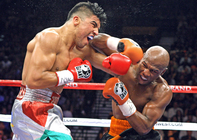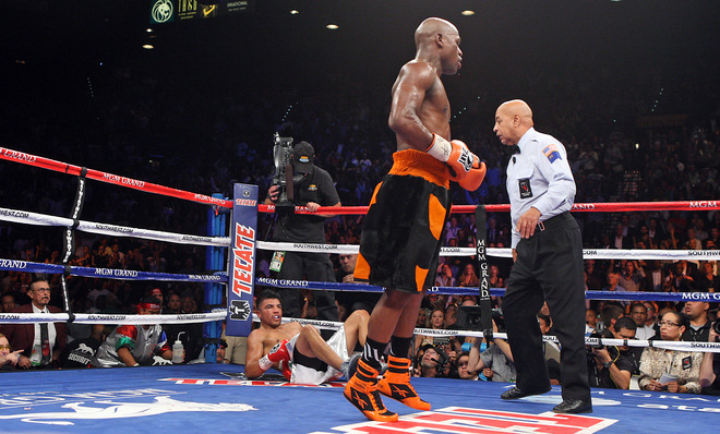 From round one, Mayweather made good on his promise to stand in front of Ortiz and pursue a knockout. Despite Ortiz weighing 164 pounds on fight night compared to Mayweather’s 150, the challenger easily abused his much bigger foe with straight rights down the middle. The high accuracy had Ortiz backpedaling and seeking to catch Mayweather with a occassional burst of hooks. Mayweather, still quick enough to back up in straight lines and tie up, did so with a mocking grin at every Ortiz flurry.