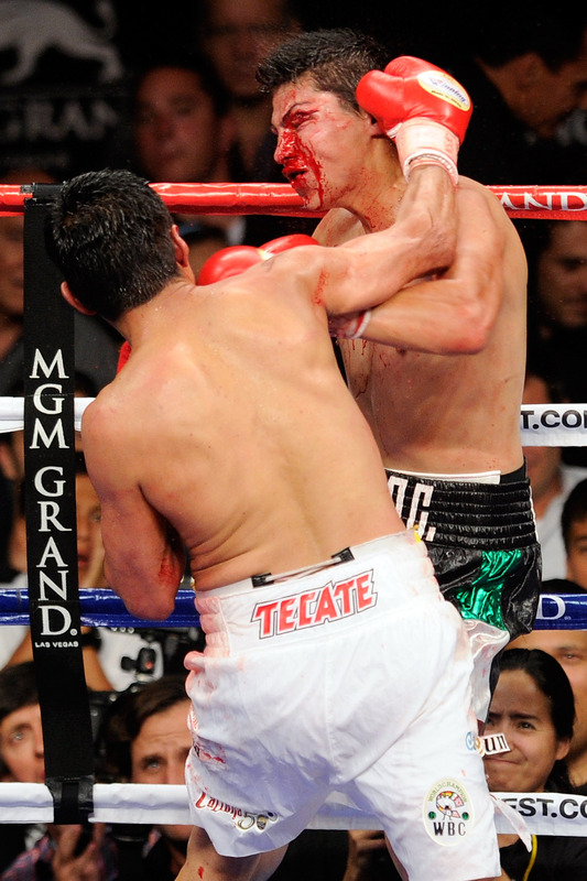 Erik Morales (52-7, 36 KOs) won his first title at junior welterweight with a brutal and bloody victory over Pablo Cesar Cano (22-1-1, 17 KOs). Early on, Morales struggled with the hand speed of Cano, who was able to land 3-4 combinations. Morales slowly pulled his young foe into a brawl by timing right hands and opening up a gushing cut that spanned the entire length of Cano’s left eye socket. Morales mixed in rights to the body, and rolled with Cano’s punches as he continued to land harder shots in close and rearrange Cano’s face into a grotesque mask. Following the 10th round, Cano’s corner pulled him to prevent further punishment.