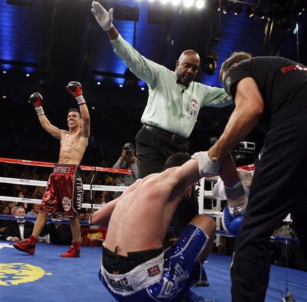 The 10th and 11th were all Martinez. The 10th saw Martinez stun Barker with a right hook and press a potential knockdown with a 30 second flurry. Although Barker covered up well and survived, Martinez smelled blood and would not let the challenger recover from the damage. The champion began the 11th with a right hook downstairs, and threw combinations punctuated by looping right hooks around Barker’s guard. The last one caught Barker behind the ear and dropped him flat of his back. Writhing in pain and holding his face, Darren Barker could only make it to his knees before being counted out.