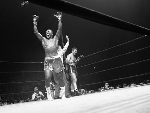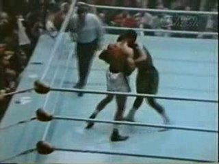 Need proof of the devastating power of a well-placed Joe Frazier left hook? Look no further than this slugfest with iron-chinned George Chuvalo. The fight was an inside war of attrition that ended when Frazier’s fist fractured the orbital bone under Chuvalo’s right eye. Chuvalo immediately pulls away in pain and capitulation. This is the only time in Chuvalo’s career that he ever wanted out of a fight.