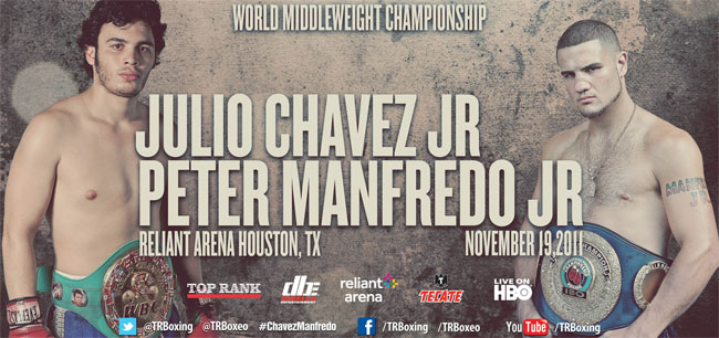 HOUSTON, TX — Julio Cesar Chavez Jr. (44-0-1, 31 KOs) showed ring generalship, power and finally killer instinct in landing over 40 unanswered punches in the fifth round to score a technical knockout over a determined but overmatched Peter Manfredo (37-7, 20 KOs).