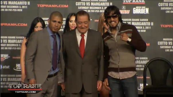 Miguel Cotto and Antonio used today’s final press conference to get in some last-minute personal insults before Saturday’s highly anticipated rematch. Margarito kicked off the animosity by stating Cotto’s punches like a “girl” and a super flyweight. Cotto countered by reiterating his stance that Margarito is a “criminal” and “embarrassment” to boxing, which invoked notable cheers from the audience. The ill will resulted in Bob Arum making sure to stand between them for photos and no final staredown.