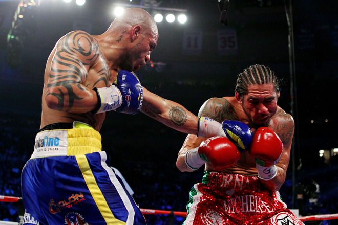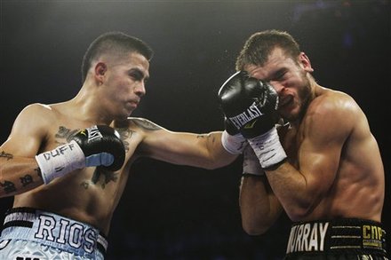 Brandon Rios (29-0-1, 22 KOs) overcame weight issues and being stripped of his lightweight title to administer a methodical beating of John Murray (31-2, 18 KOs). Rios, who failed to make the bout’s contracted weight of 135 pounds and was stripped of his WBA belt, relied heavily on uppercuts to break down Murray (whose face was marked by a bloody nose and swelling, discolored eyes by the sixth round). Rios would secure the stoppage in the 11th after a succession of left uppercuts had Murray out on his feet.