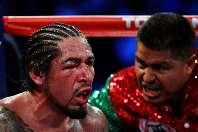 The ringside doctor and physicians immediately descended on the corner to inspect the eye before the 10th. Referee Steve Smoger was reluctant to stop it as Margarito jumped to his feet to show he could continue. Smoger asked several times for a final verdict before the ringside physician confirmed the bout should be stopped, much to the disgust of Margarito.