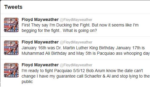 “I’m ready to fight Pacquiao 5/12 [sic],” said Mayweather. “Bob Arum know [sic] the date [and it] can’t change. I have my guarantee. Call Schaefer and Al [Haymon] and stop lying to the public… January 16 was Dr. Martin Luther King birthday. January 17 is Muhammad Ali birthday and May 5 is Pacquiao ass whooping day!”