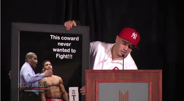Yuriorkis Gamboa again was a no-show yesterday at the Los Angeles press conference for his proposed April 14fight with Brandon Rios. Gamboa, like Kelly Pavlik last year in his dispute with Top Rank, claims that he never signed a contract and wouldn’t move forward with the fight until Top Rank met his financial requirements. Top Rank hasn’t denied the lack of a written contract, but president Todd duBoef states in both below videos that a verbal agreement from Gamboa’s camp was in place before they moved forward with the promotion. Rios was much more subdued than the last presser, but still views Gamboa as a coward.