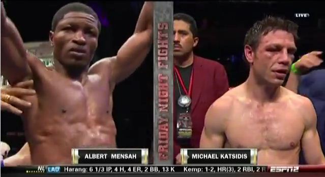 Final scorecards for the bout read 95-95, 96-94 and 98-92 for Mensah, who improves to 25-3-1, with 10 KOs. Katsidis falls to 28-6 (23 KOs)