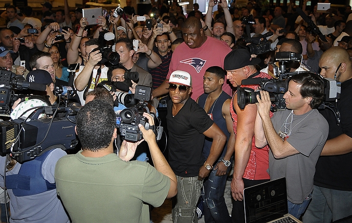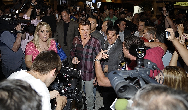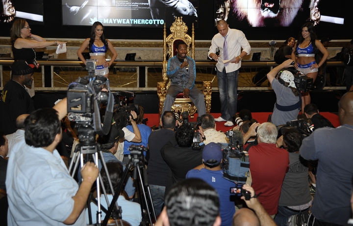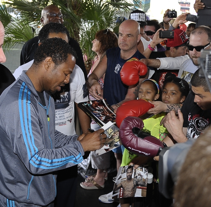 The main fighters for this Saturday’s (May 5) big pay-per-view card made their “grand arrivals” yesterday at the MGM Grand. Fans were treated to autographs and a few photo opportunities as the four men make their final press stops before Friday’s weigh-in. In keeping with the “Ring Kings” theme, each fighter took turns sitting at a makeshift throne.