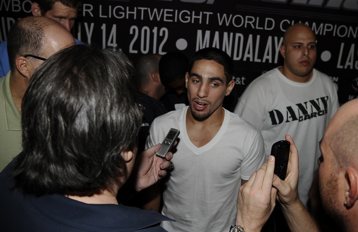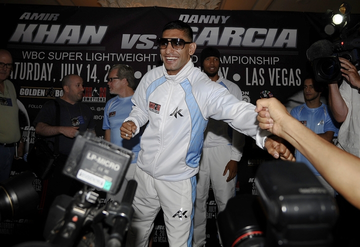The bout will be a unification showdown with Khan putting up his “Super” WBA junior welterweight title against Garcia’s WBC strap. For those wondering, Danny’s outspoken father Angel Garcia appears to have kept his controversial opinions in line yesterday. Friday’s weigh-in will let us know what type of shape they’re in, but from their faces and physique outlines both look to be well-prepared.