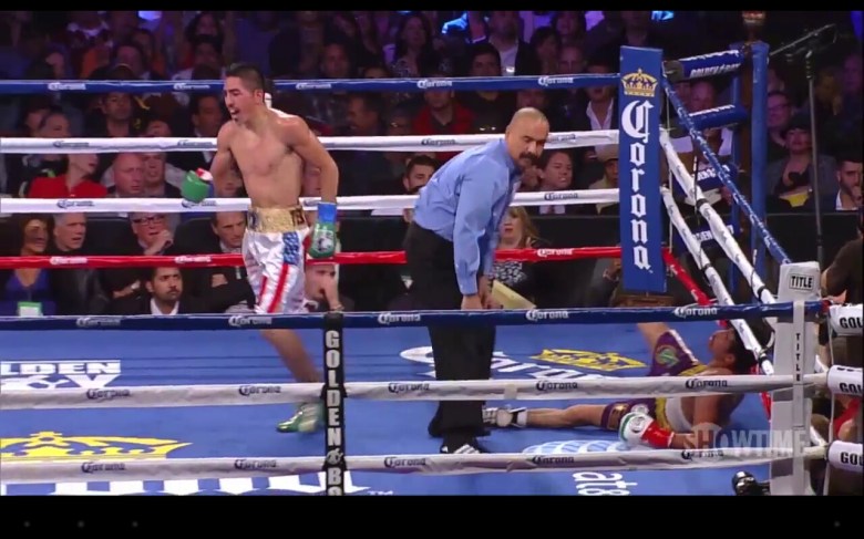 Whenever Mares would take a breather, Moreno accuracy would shine. At mid and long range, Moreno would snap back Mares’ head with his southpaw staight left and right jabs. The problem for Moreno is that Mares, clearly the bigger man, could take this punches and would explode with flurries to push Moreno back on his heels. Mares began finding the range with the overhand and straight right and hurt Moreno for the first knockdown of his career in the fifth. At that point, Moreno was only saved by the bell and appeared to be on the way out of there.