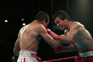 In the first minute of the fight I was getting to Pacquiao easily. He seemed very tentative and I decided this would be a good time to be more aggressive – as a surprise attack — and back him up.