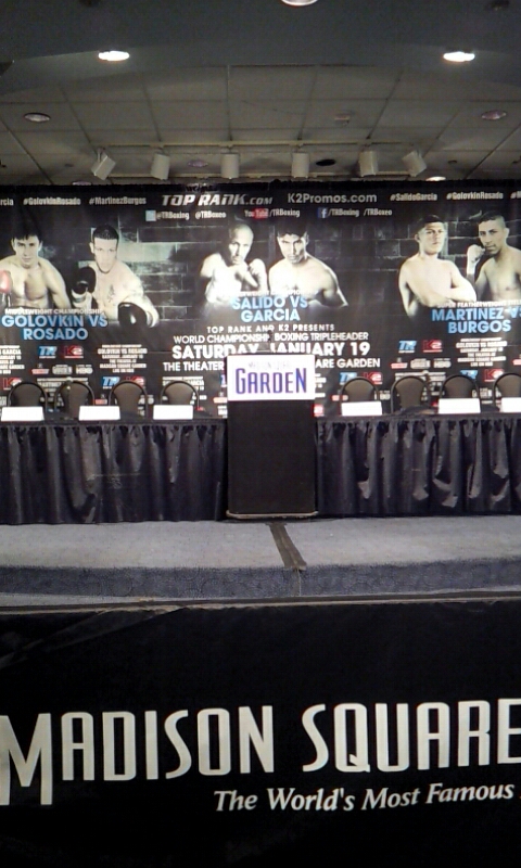 GOLOVKIN THE MEDIA DARLING: Everyone loves Gennady! That was pretty much the sentiment today. From writers scrambling for pictures with him to getting additional photo-ops with his arms filled with Tecate girls, Golovkin’s care-free attitude never wavered. He actually sat with the media for a bit before getting on stage where I could hear his advisers coaching him on English translations and what to cover. I also found out that English is the fourth language Golovkin is learning. It was nice to see him show up in a Rangers jersey, but it’d really warm my heart to see him in the Knicks orange and blue on fight night. It’s only right for MSG.