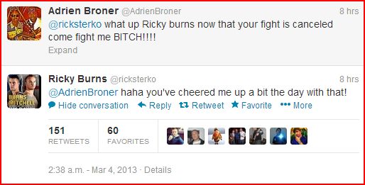 Adrien Broner, who earlier today believed Burns had canceled the bout and was now free, sent out a Tweet challenging burns to a unification matchup.