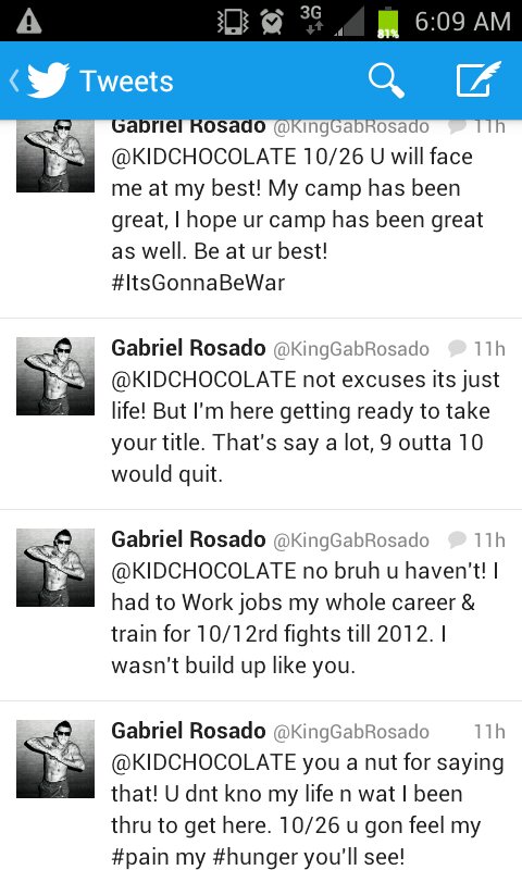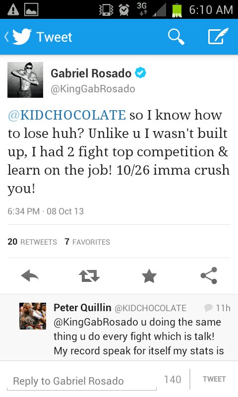 Despite having a media conference call scheduled for later this afternoon, Gabriel Rosado and WBO middleweight titlist Peter Quillin couldn’t wait to exchange pleasantries and took to Twitter last night to state their cases for the October 26 bout.