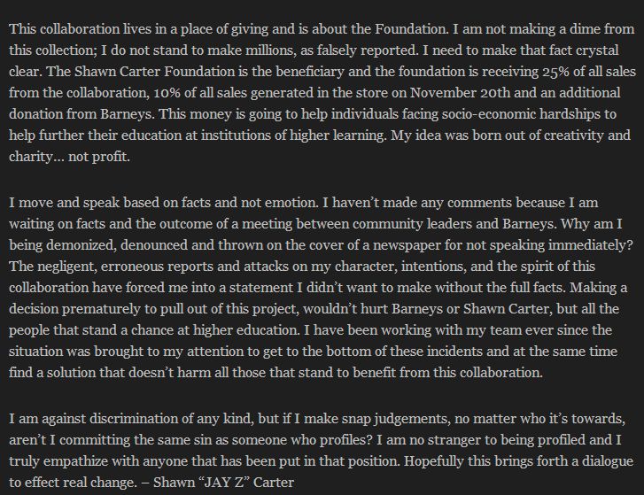 Earlier today, Jay Z took to his website Life and Times to release an official statement on the matter detailing the extent of the business partnership, his views on the racial discrimination accusations, and his course of action.