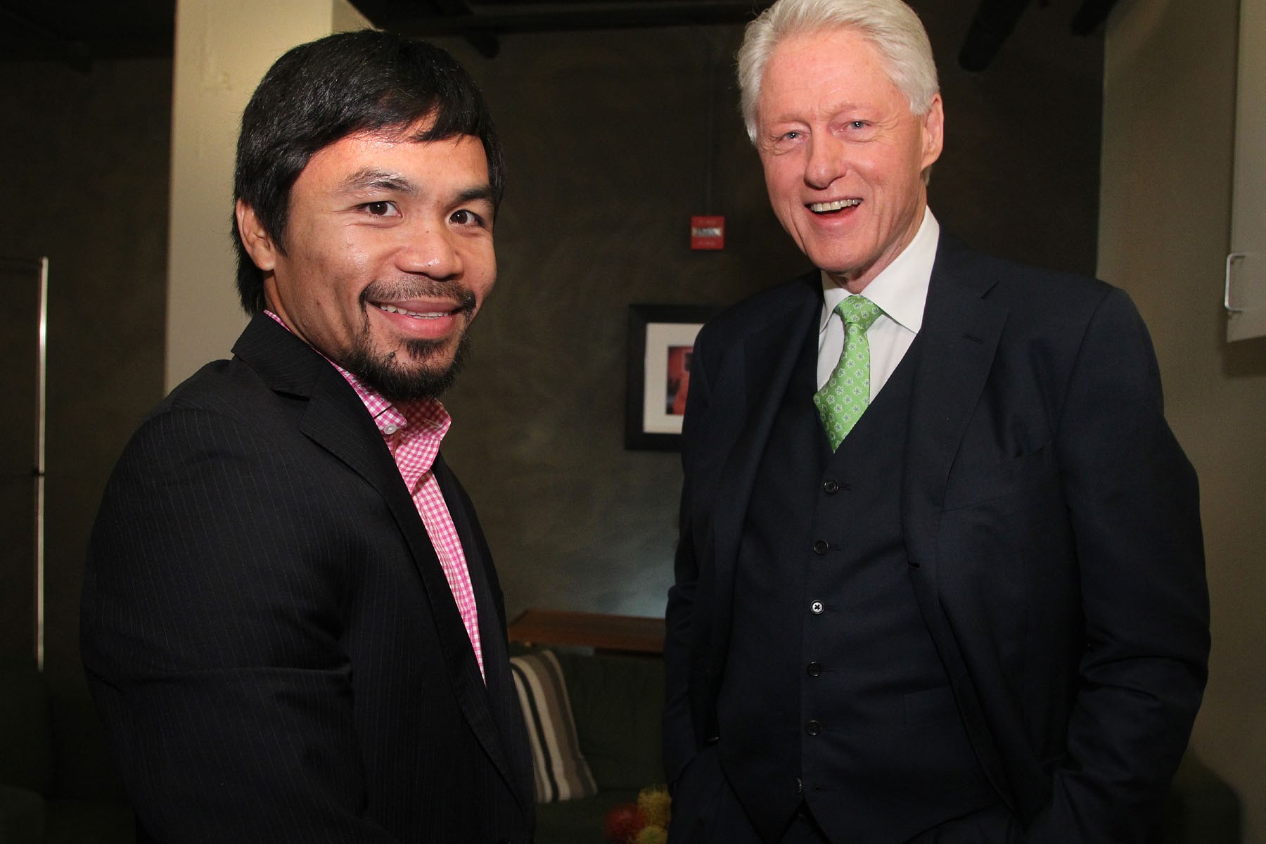 Manny Pacquiao is still on the media grind one week before he has one of the more important fights in his career when he rematches Timothy Bradley. Last night, Pacquiao was in Hollywood to tape an interview segment for Jimmy Kimmel and ran into former president Bill Clinton. Pacquiao spoke at length again about the fight’s selling point (“Does Manny still have his killer instinct?”). The card airs live on HBO pay-per-view on April 12.