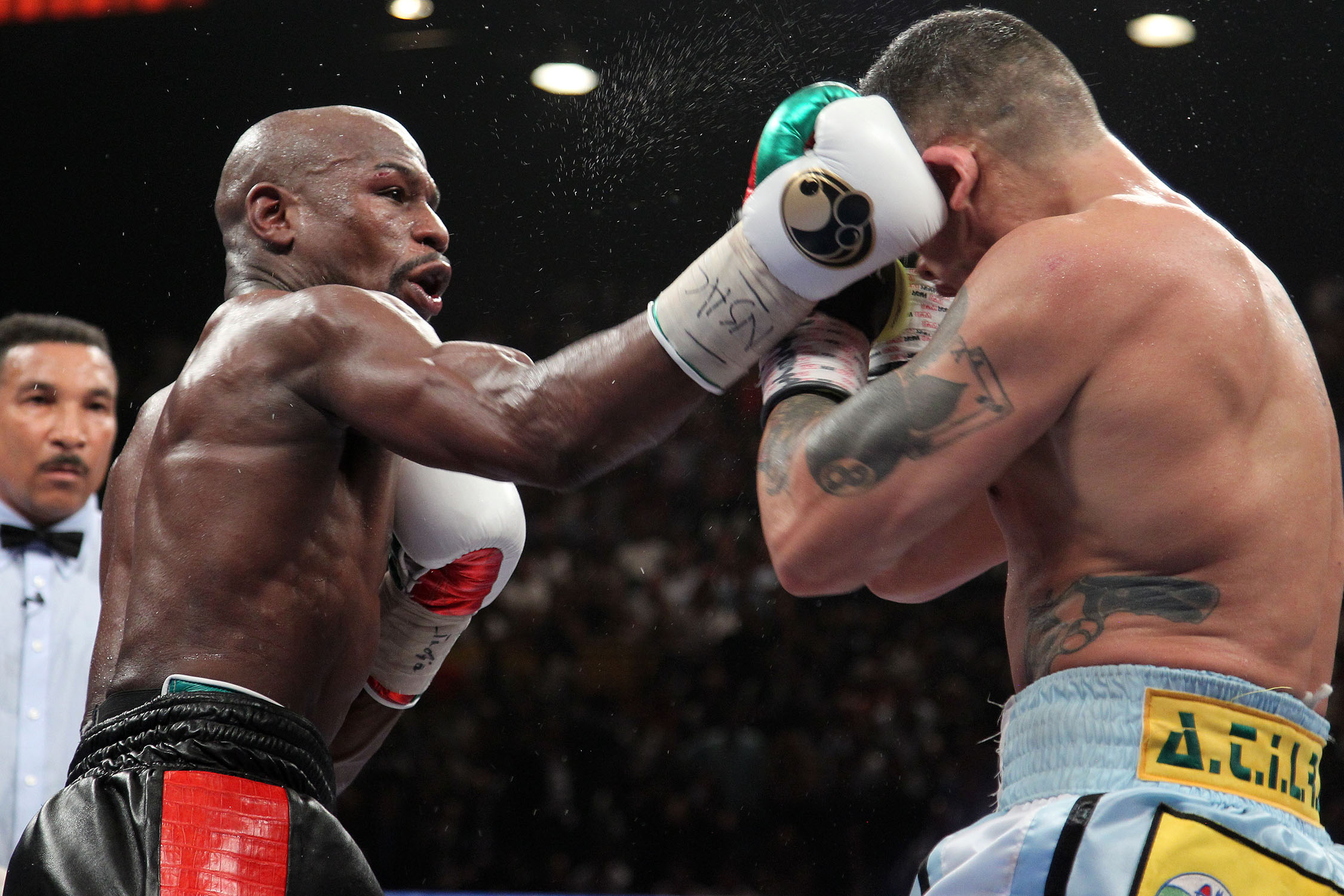 Through the first four rounds, Maidana dragged Mayweather into a grind-out, foul heavy war of attrition. An accidential head butt opened a cut over Mayweather’s right eye, and the undefeated champion struggled to keep Maidana from landing left hooks to the body and chopping overhand rights. Even with Maidana’s success, Mayweather kept the fight close through his own accurate body shots, lead rights and counter left hooks.
