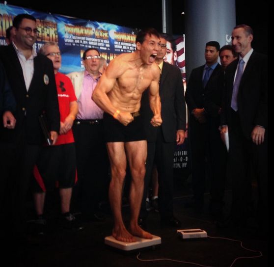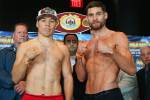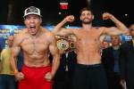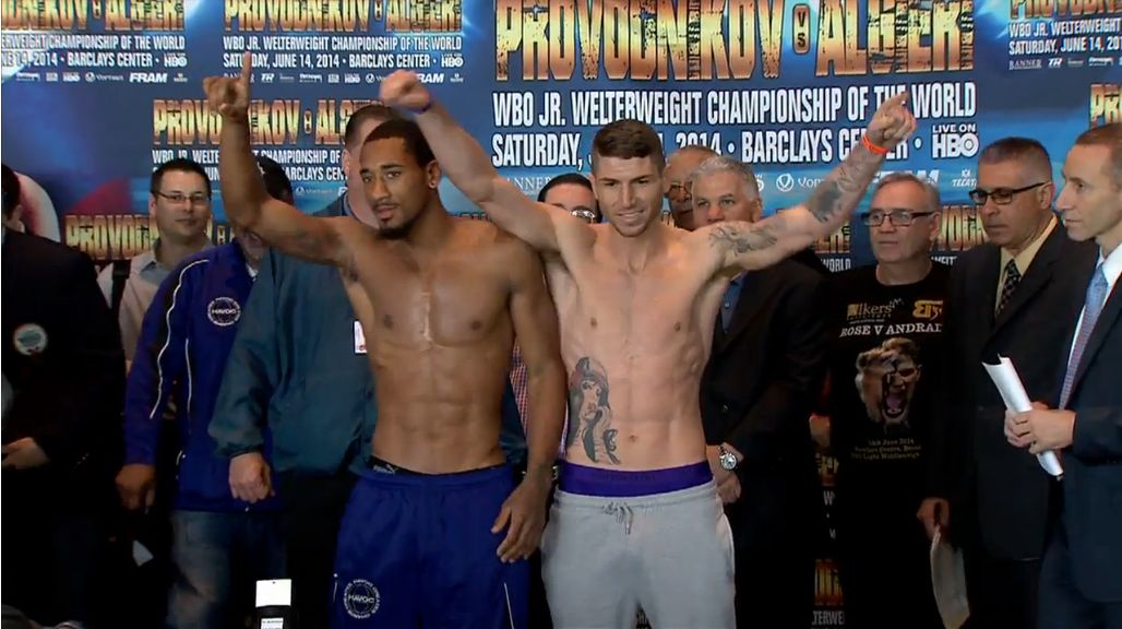 BROOKLYN, NY — Just moments ago, WBO junior welterweight titlist Ruslan Provodnikov and undefeated challenger Chris Algieri completed their weigh-ins for tomorrow night’s HBO main event. As noted below, Algieri was ripped at 140 pounds. Provodnikov looked coming in below the 140-pound limit. The co-main event will feature WBO light middleweight titlist Demetrius Andrade facing off against Brian Rose.