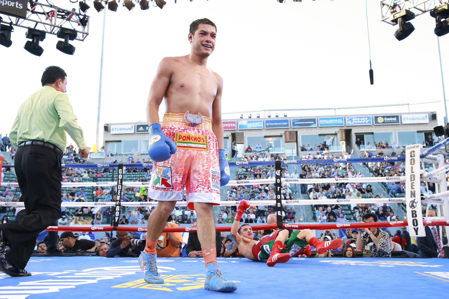 CARSON CA — A bad cut and lingering hand problems weren’t enough to deter WBC lightweight titlist Omar Figueroa, who successfully defended his strap with a 9th round TKO of Daniel Estrada last night at the StubHub Center.