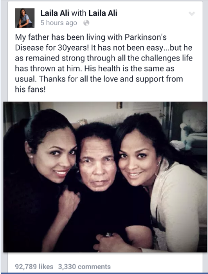 Laila Ali posted the above picture to her Facebook this morning thanking fans for their concern and support. Last year, Rahman Ali caused a similar media uproar when he claimed that his brother was just days away from death, prompting strong condemnations from family members.