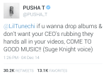 You can read Tweets below in addition to a final humorous one from Pusha T (Writer’s Note: If you’re too young to remember the mid-90s, click this video to get the joke).