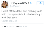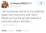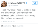 In a series of Tweets, Wayne claimed he is being held “prisoner” due to label heads Bryan “Baby” and Ronald “Slim” Williams refusing to release the album. Furthermore, Wayne apologized to his family and fans for the situation.