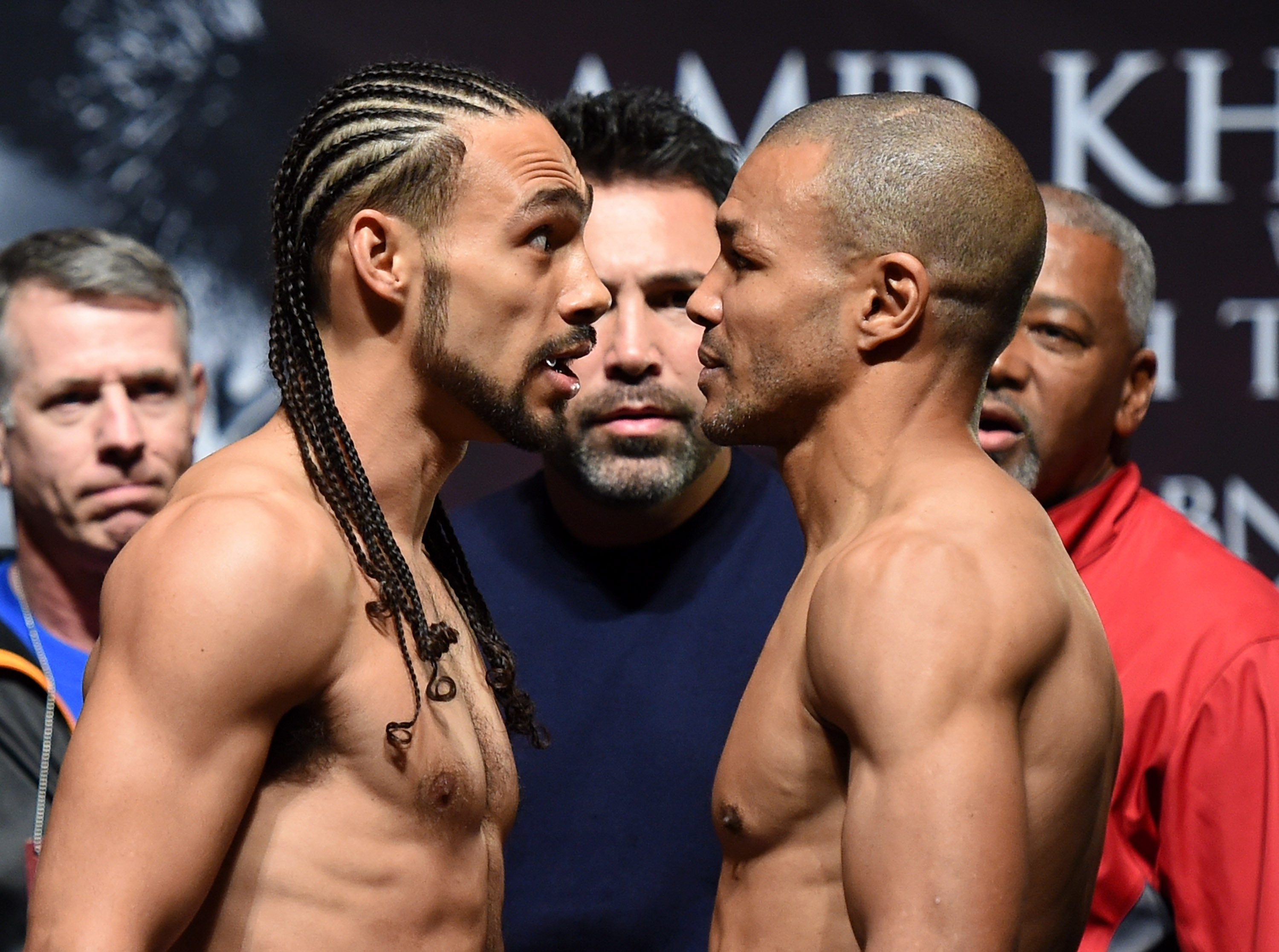LAS VEGAS, NV – DECEMBER 12: Boxers Keith Thurman (L) and Leonard Bundu face off during their official weigh-in at the MGM Grand Garden Arena on December 12, 2014 in Las Vegas, Nevada. Thurman will defend his WBA interim welterweight championship against Bundu on December 13 in Las Vegas. during their official weigh-in at the MGM Grand Garden Arena on December 12, 2014 in Las Vegas, Nevada. (Photo by Ethan Miller/Golden Boy/Golden Boy via Getty Images)