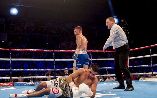 BELFAST, IRELAND — Carl Frampton got the last laugh in the war of words with Chris Avalos by scoring an emphatic fifth round TKO to retain the IBF super bantamweight title.