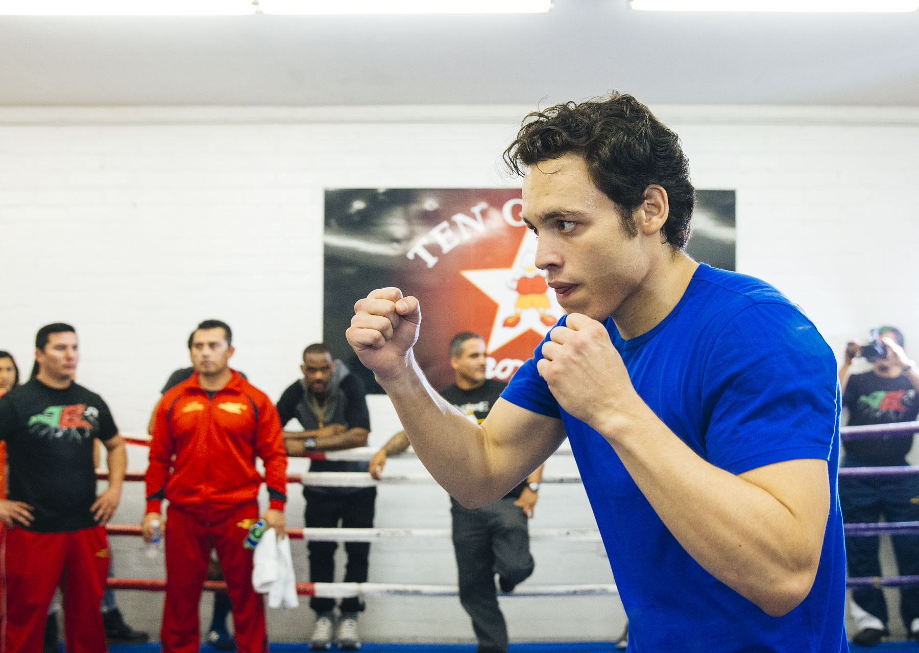 LOS ANGELES, CA — Julio Cesar Chavez Jr. met the media last Friday for his final media workout ahead of facing Andrzej Fonfara on Saturday (April 18). The bout will be Chavez’s first againt a light-heavyweight and with new trainer Joe Goossen. Take it for what it’s worth that Junior opted to trained with his shirt on.