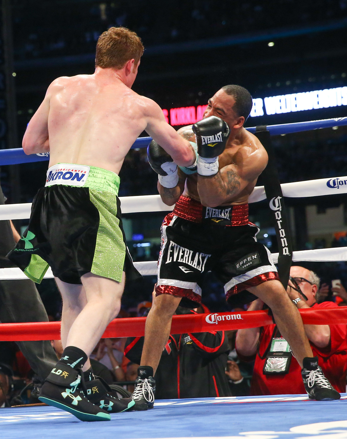 HOUSTON, TX - MAY 9: Saul "Canelo" Alvarez (black/green trunks) and James Kirkland (black/red trunks) during their 12 round super welterweight fight at Minute Maid Park on May 9, 2015 in Houston, Texas. (Photo by Ed Mulholland/Golden Boy/Golden Boy via Getty Images) *** Local Caption ***Saul Alvarez; James Kirkland