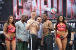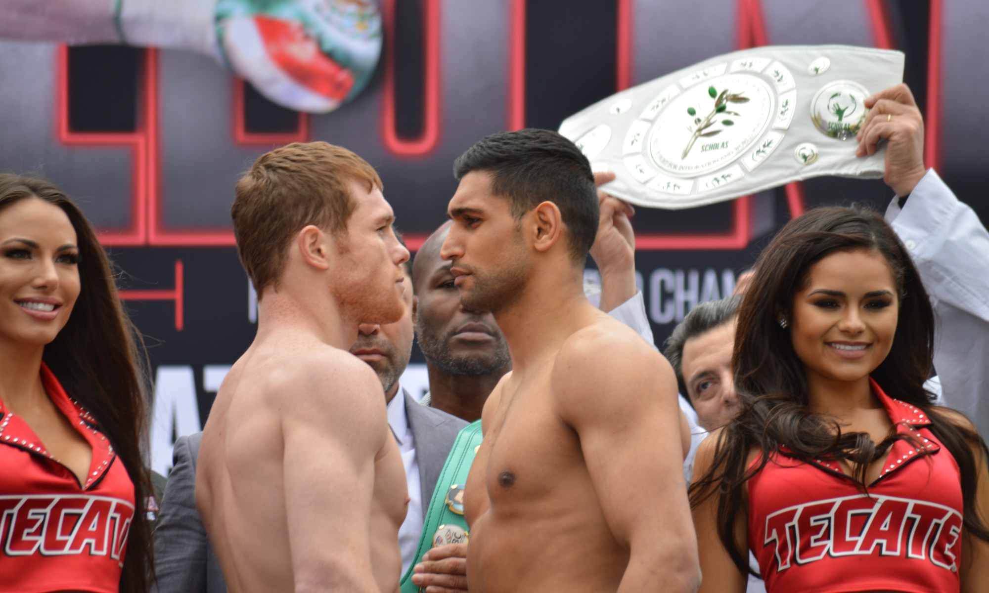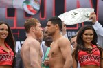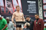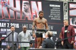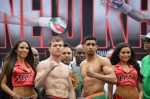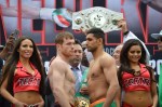 LAS VEGAS — There were no weight hiccups in Vegas today as main eventers Canelo Alvarez and Amir Khan both weighed at their agreed upon catchweight of 155 pounds. Both men looked solid at the weight.