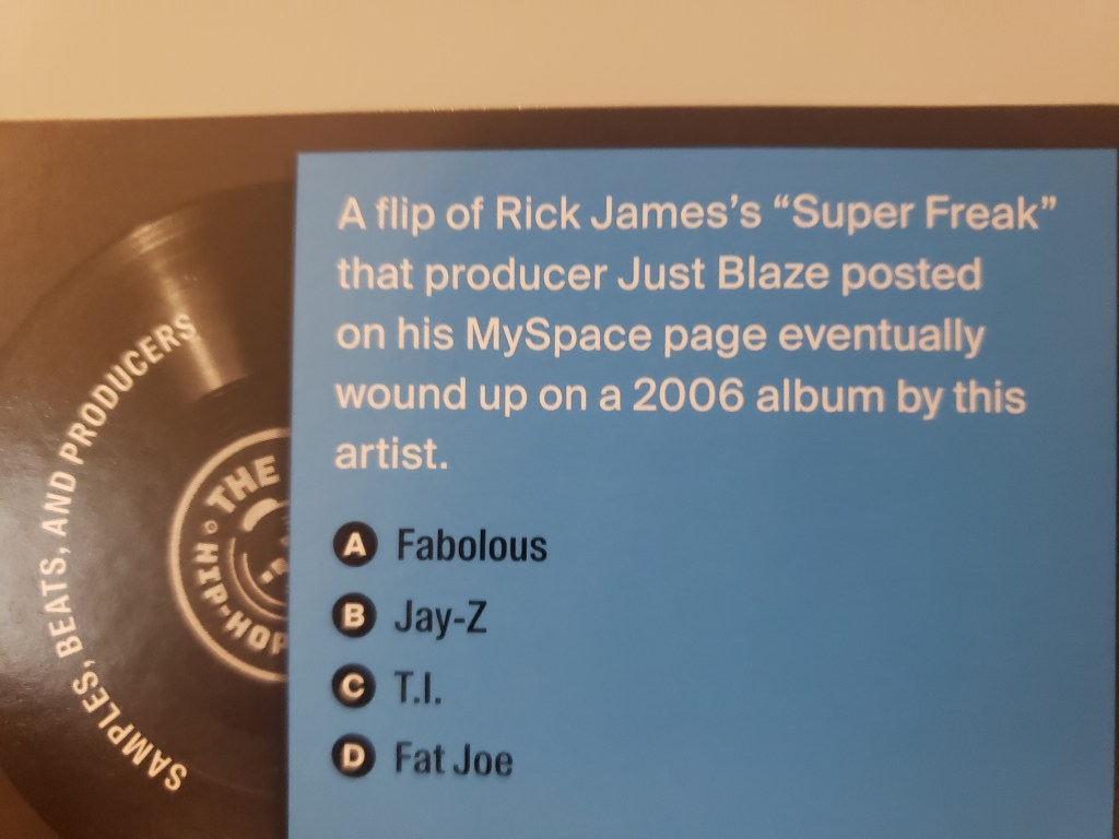 The trivia questions run the gamut of hip-hop’s 70s origins to even recent stars like Megan thee Stallion. Older millennials will immediately note there’s a sweet spot for them as their knowledge, in theory, should straddle neatly between old and new school sensibilities. However, younger fans who know their history can hold a distinct advantage with post 2010 content. Below are samples of the multiple choice questions: